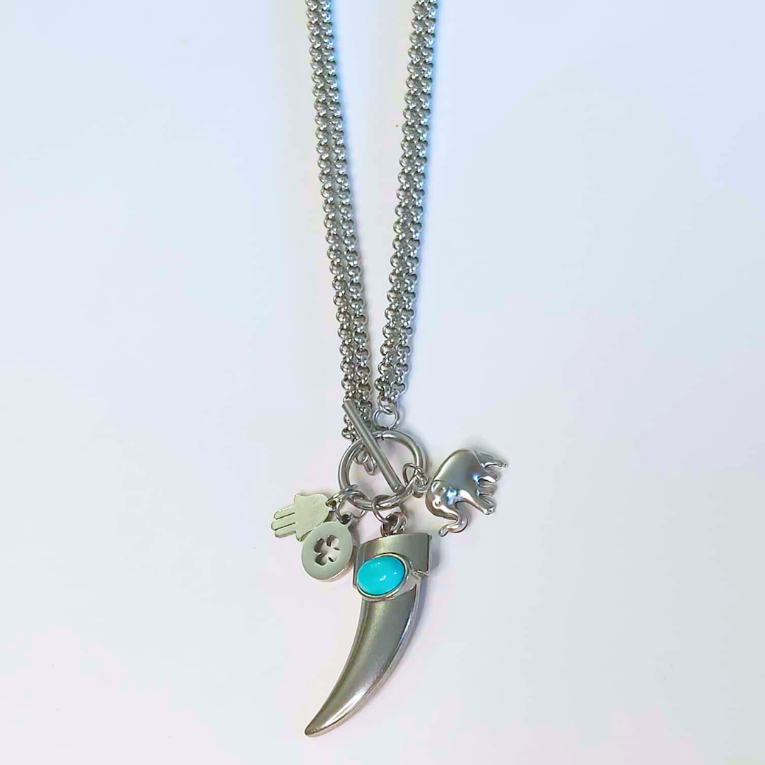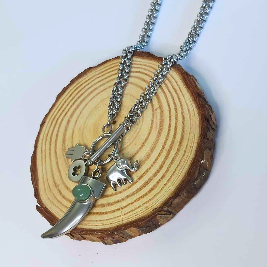 Colar em aço inoxidavel com corno com pedra natural e amuletos protetores