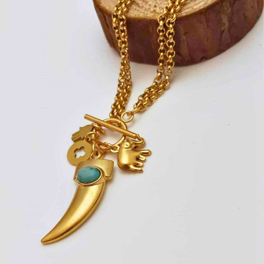 Colar em aço inoxidável com corno em aço inoxidável e amuletos protetores