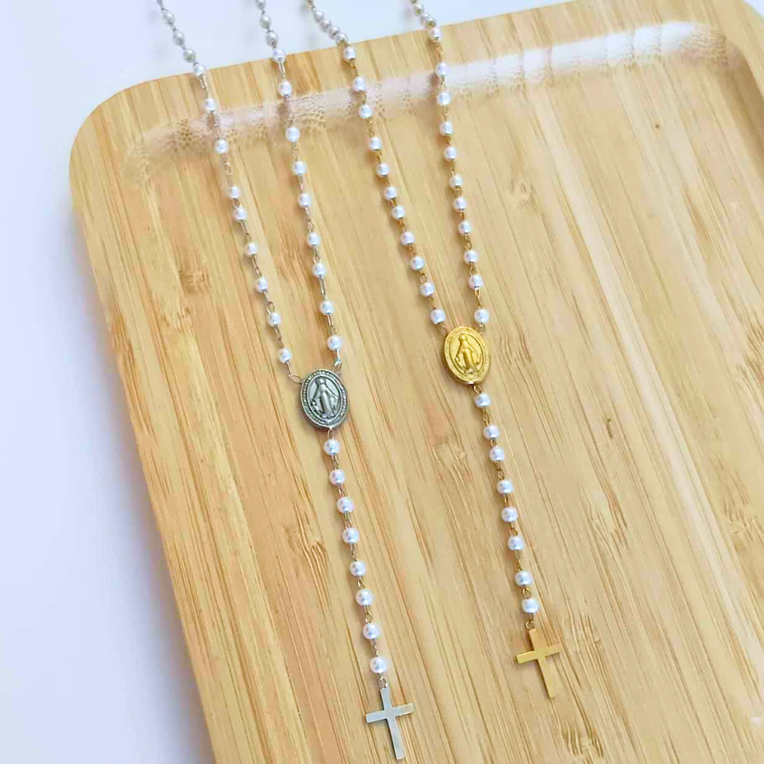 Terço de perolas com nossa senhora e cruz em aço inoxidavel