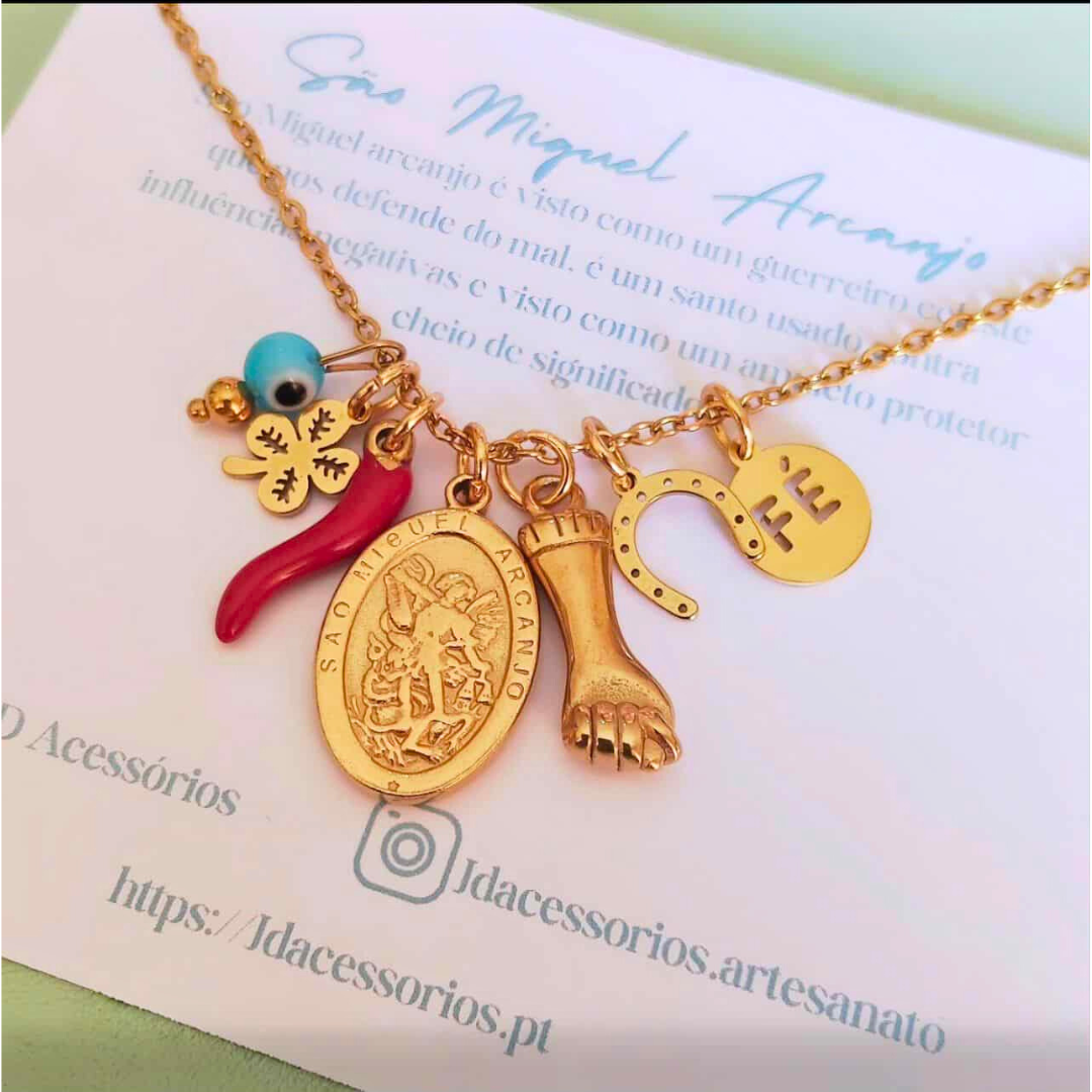 Colar em aço inoxidavel com são miguel arcanjo com amuletos protetores