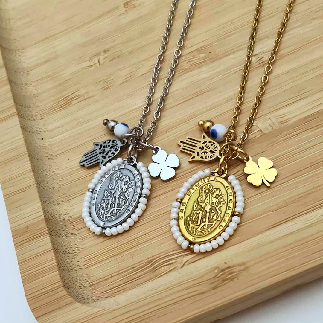 Colar em aço inoxidável com são Miguel arcanjo com amuletos protetores
