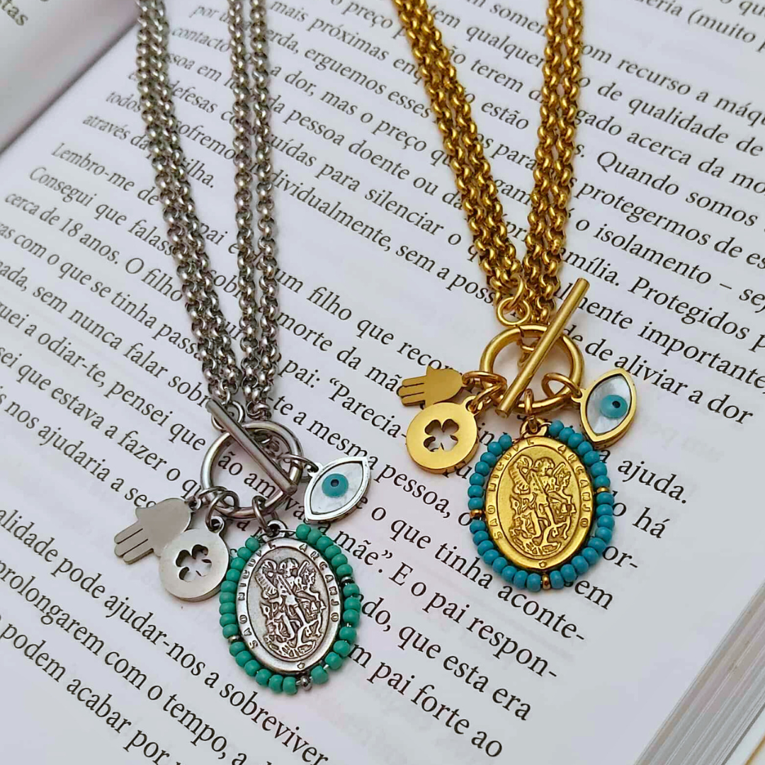 Colar duplo com são miguel arcanjo com amuletos protetores
